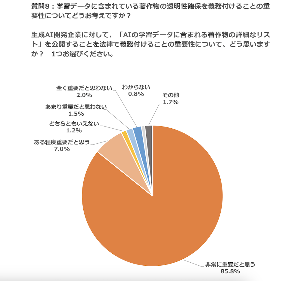 それでも、クリエイターが生成AIに関する国などの政策に対して求めることとして、「作品の無断利用の防止」が最も多いということは留意すべき点かと思います。たとえば、学習データの詳細リスト公開義務化を支持する声は92.8%(「非常に重要だと思う」85.8%+「ある程度重要だと思う」7.0%)を占めました。