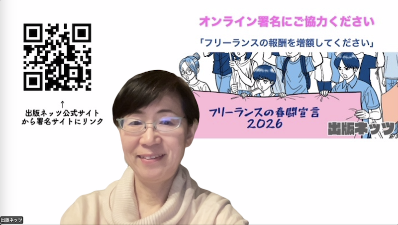 出版ネッツは団体賛同として、当日午前中に行われたオンライン集会では「フリーランスの春闘宣言2026」をアピール。