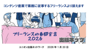 出版ネッツでは、2022年以来、毎年、「フリーランスの春闘宣言」を発出し、1990年代からまったく上がっていないコンテンツ産業で働くフリーランスの報酬を上げようと、取り組みを行なっています。このままではコンテンツ制作の技 […]